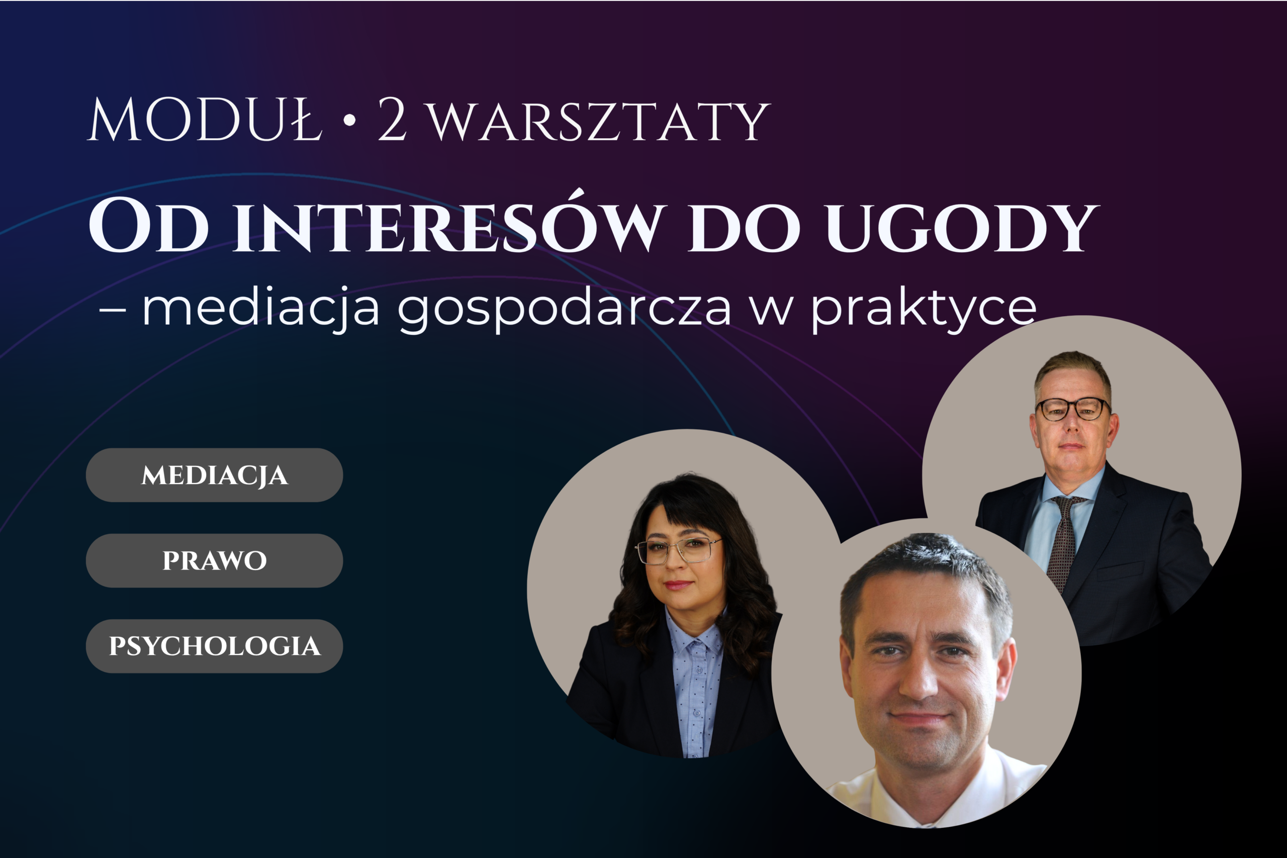 Moduł rozwija warsztat prowadzenia mediacji gospodarczych w oparciu o podejście negocjacyjne oraz praktyczne rozwiązania stosowane w pracy mediatora. Jest przeznaczony dla osób, które znają podstawy mediacji i chcą poszerzyć perspektywę, uporządkować narzędzia oraz wzmocnić skuteczność prowadzenia procesu — od diagnozy interesów stron po wypracowanie i doprecyzowanie ugody.